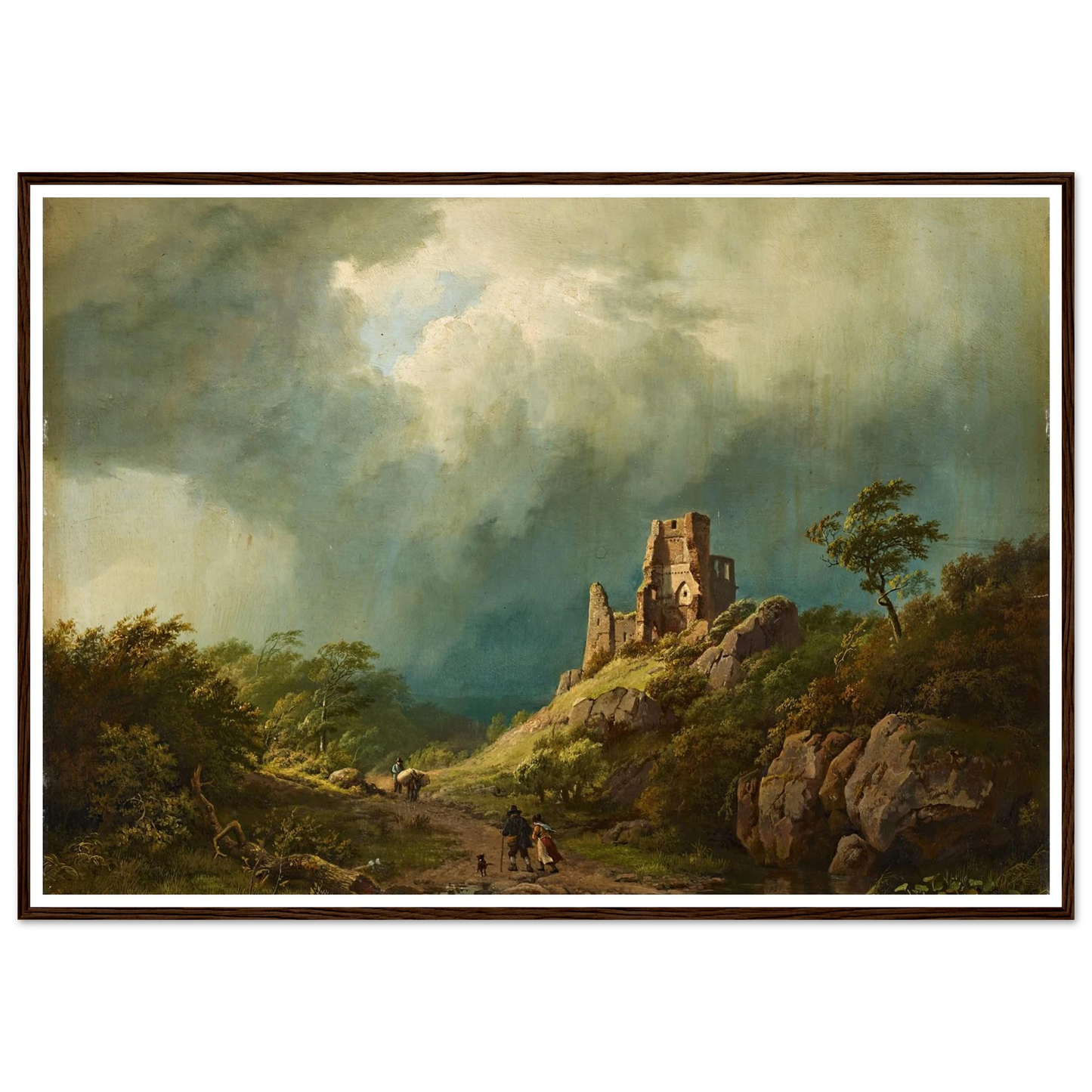 Reisende, die in einer stürmischen Landschaft an einer Burgruine vorbeikommen (1835) Kunstdruck | Barend Cornelis Koekkoek